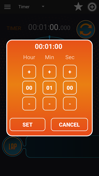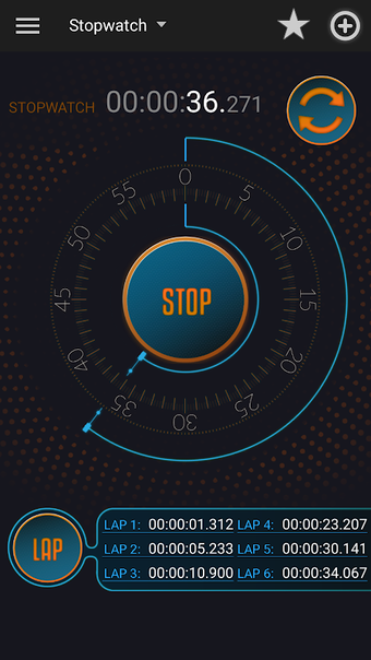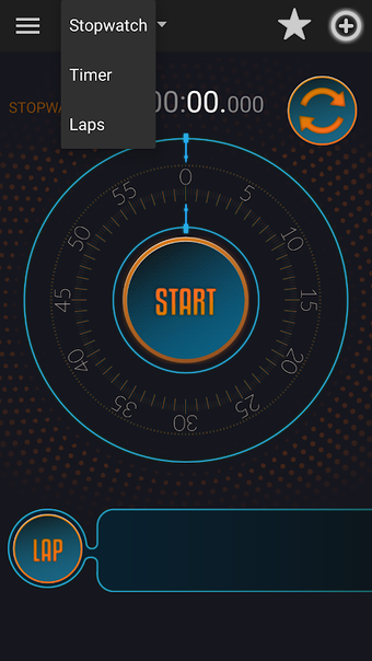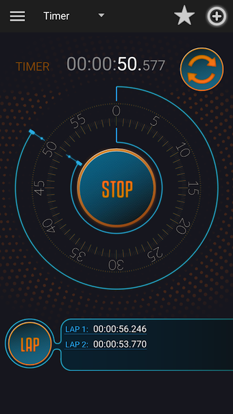 Im Stoppuhr-Modus können Benutzer die Zeit einfach starten und stoppen, indem sie den Knopf in der Mitte des Bildschirms drücken. Um Rundenzeiten aufzuzeichnen, tippen Sie einfach auf den 'LAP'-Knopf. Die App verfügt auch über eine Rundenliste, die über das Dropdown-Menü zugänglich ist und es bequem macht, mehrere Runden im Blick zu behalten.